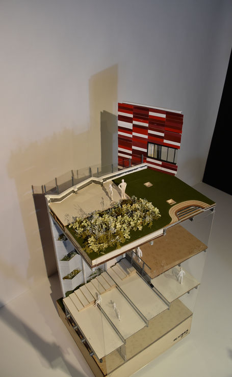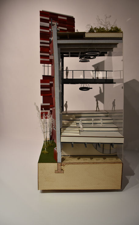 The building, with stepped-back terraces and a ramping roof, and the site encourages wise draining of storm-water, and frequent flood waters of the nearby creek, into the lowest point of the site (the southwest corner) to a rain garden and arboretum that offers water to swim in and plants to study in addition to the educational experience of the Discovery Center. New hardscaping connects from adjacent baseball fields to the neighboring Carousel and Mini-golf course, creating a leisure and athletics Hub in the city; ideas were floated of making the paneling into a climbing wall, or the addition of basketball courts and hockey rinks, too.