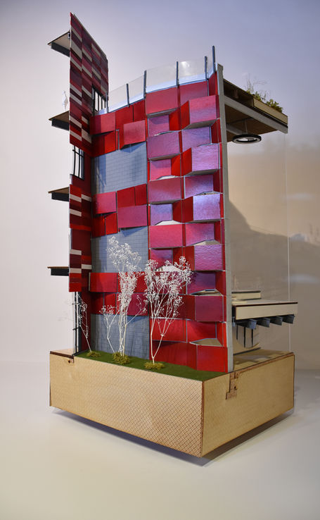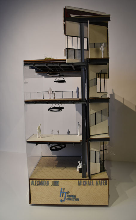 Following our Schematic Design Review, Alex and I changed several components of our design, including: material changes for the majority of exterior walls, entirely removing the over-sized atrium space between the two building wings, the terraced north-side roof changed into a steady sloping gradient with ramps wiggling up, mirroring the locations of the retail and classroom spaces on the ground floor, and further developing the open areas on the roof terraces. In addition, the atrium space was relocated into the envelope of the building rather than being an appendage.