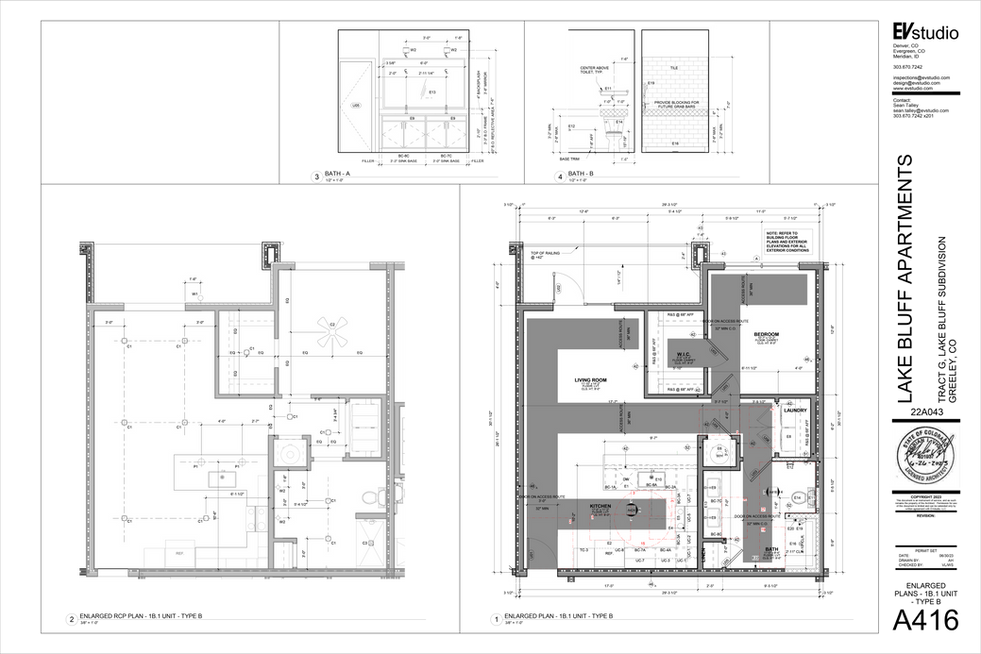 My role in refining the Unit Plans centered on subtle yet critical adjustments—shifting walls, nudging swinging doors, and repositioning appliances and fixtures to satisfy ANSI clearance zones, highlighted in red on the Enlarged Plans. These refinements ensured that turning radii and accessible circulation paths were not only compliant but spatially intuitive.