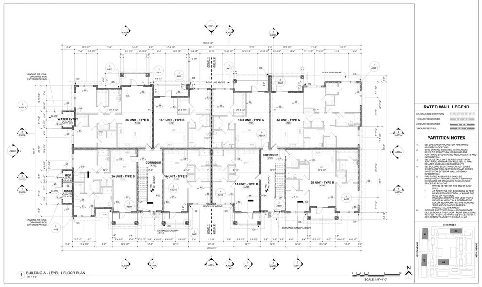 As the support role for the design of the Apartment Building and Unit Plans, I was responsible for Code Compliance and detailing, including:
